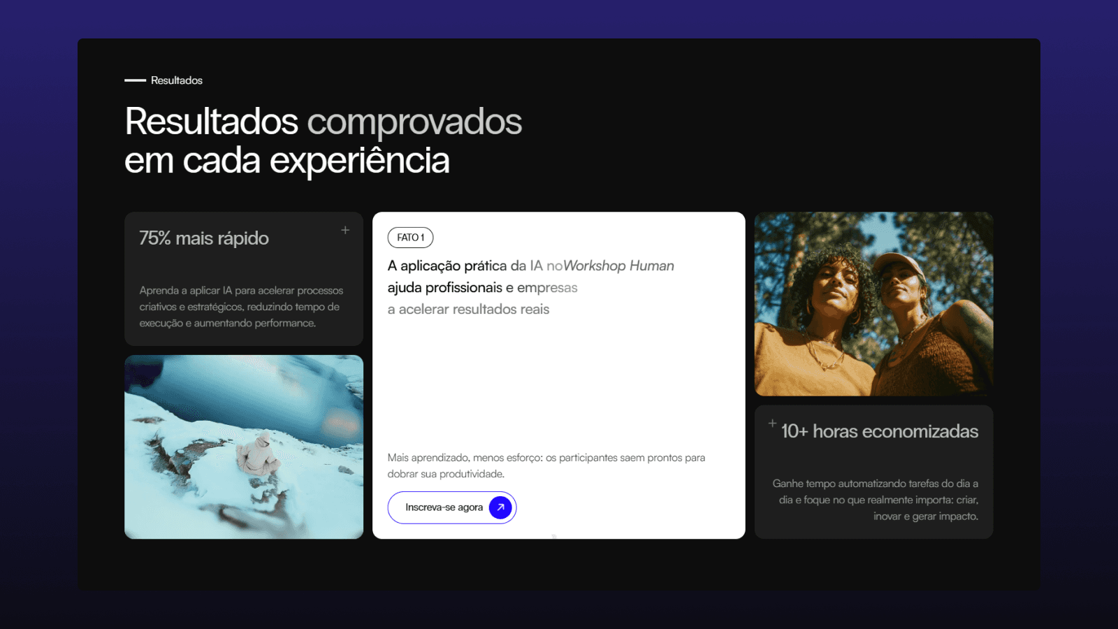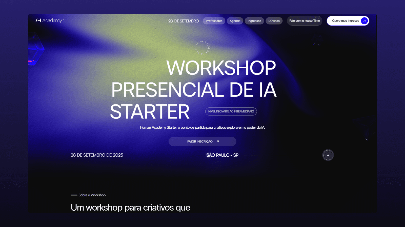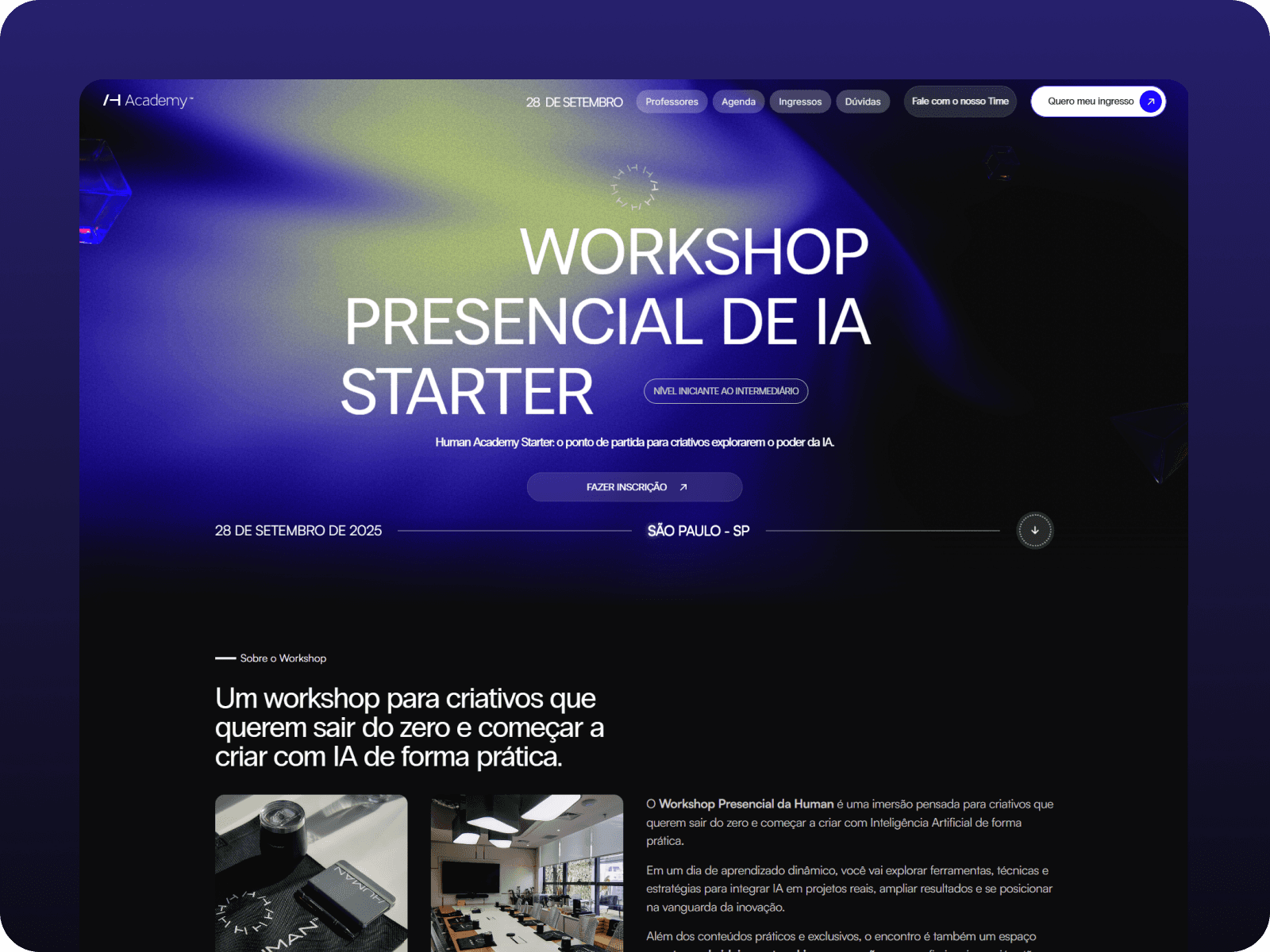 A landing page do Human Workshop quebrou recordes: foi uma das páginas com maior número de inscrições por hora e menor tempo de entrega considerando o nível de refinamento. Este projeto reforça o posicionamento do GG Studio como referência absoluta em design para eventos de alta performance.