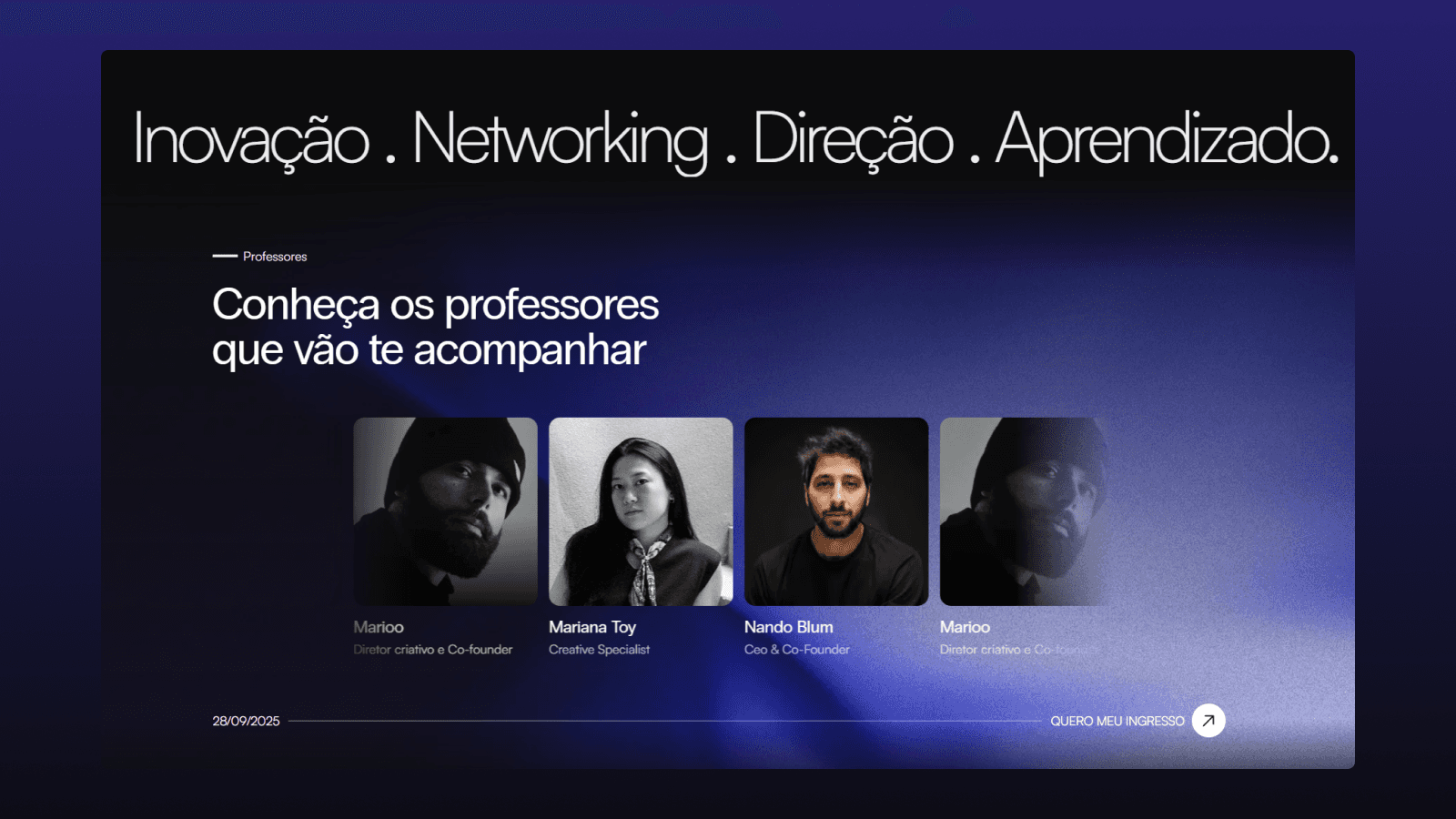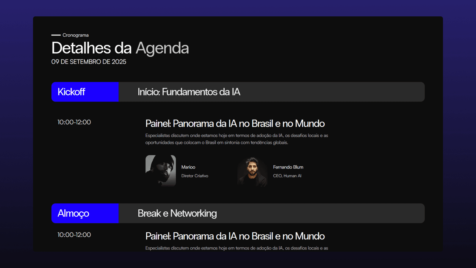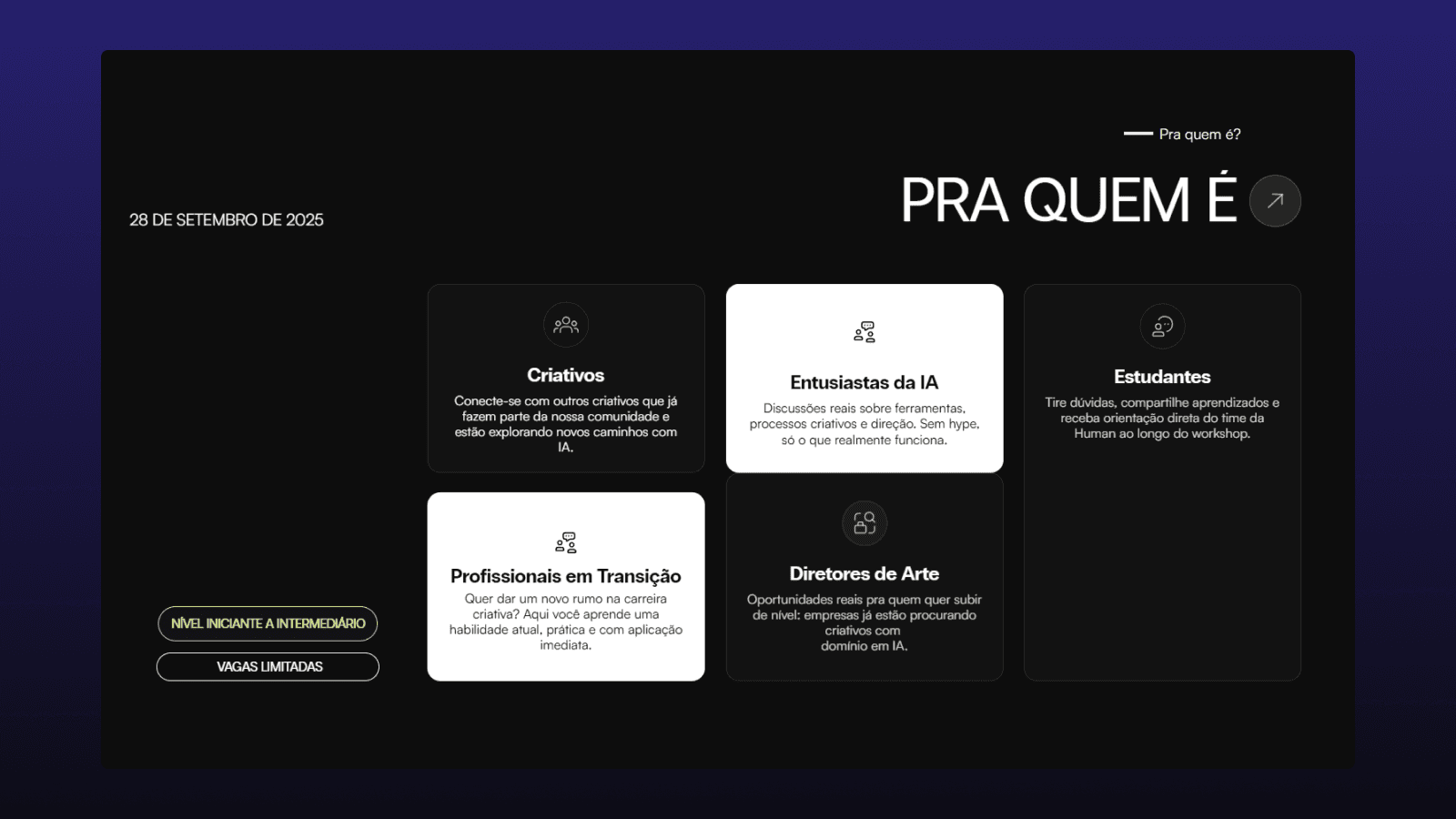 A landing page do Human Workshop quebrou recordes: foi uma das páginas com maior número de inscrições por hora e menor tempo de entrega considerando o nível de refinamento. Este projeto reforça o posicionamento do GG Studio como referência absoluta em design para eventos de alta performance.