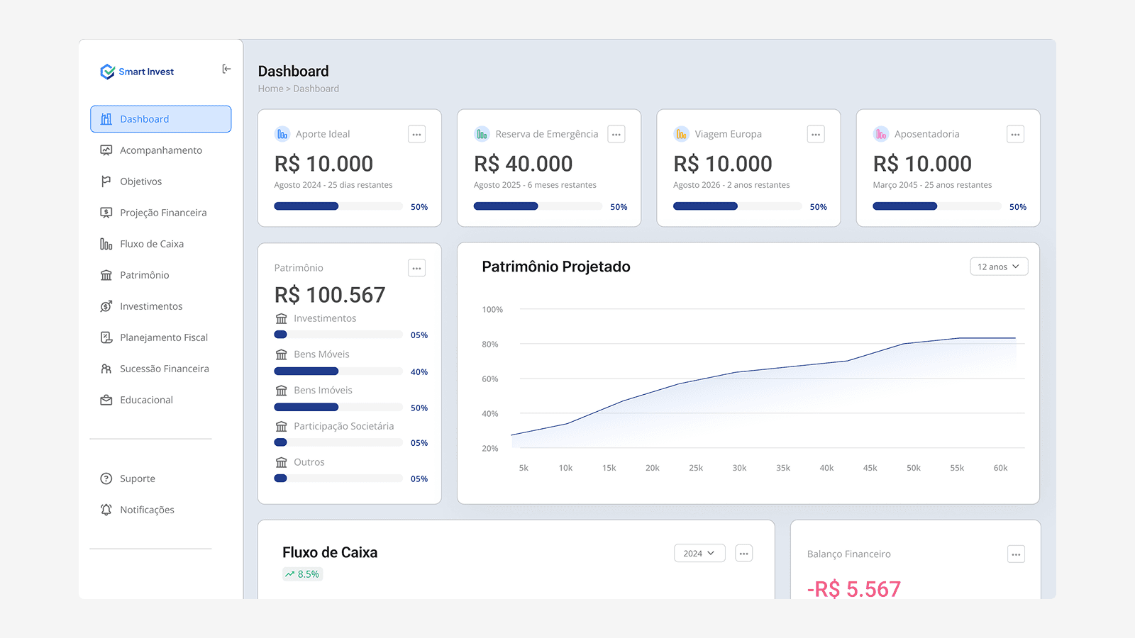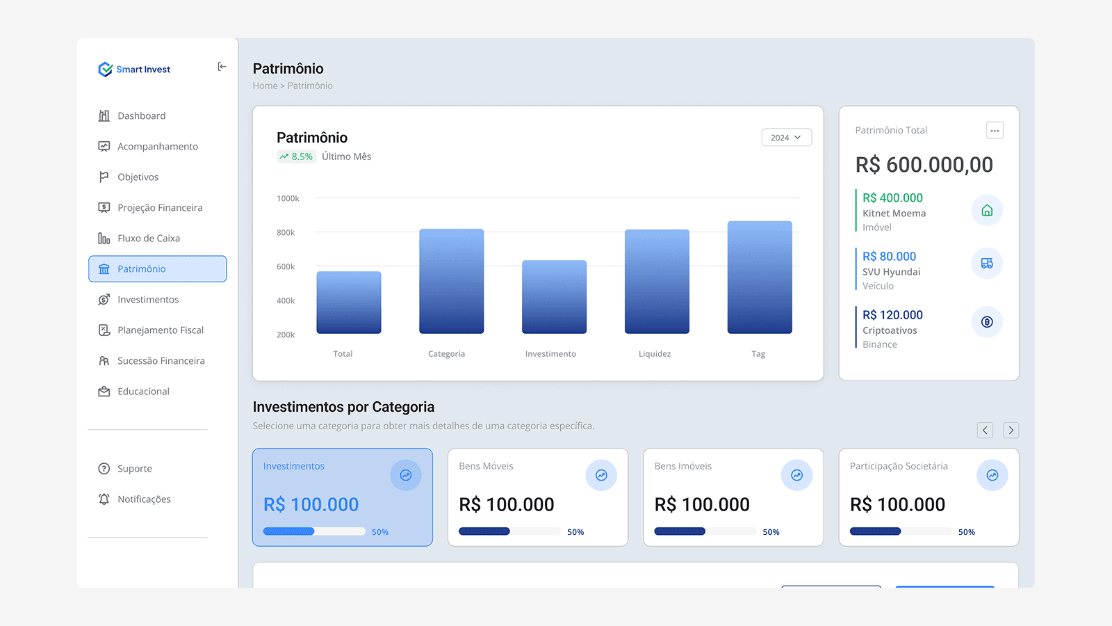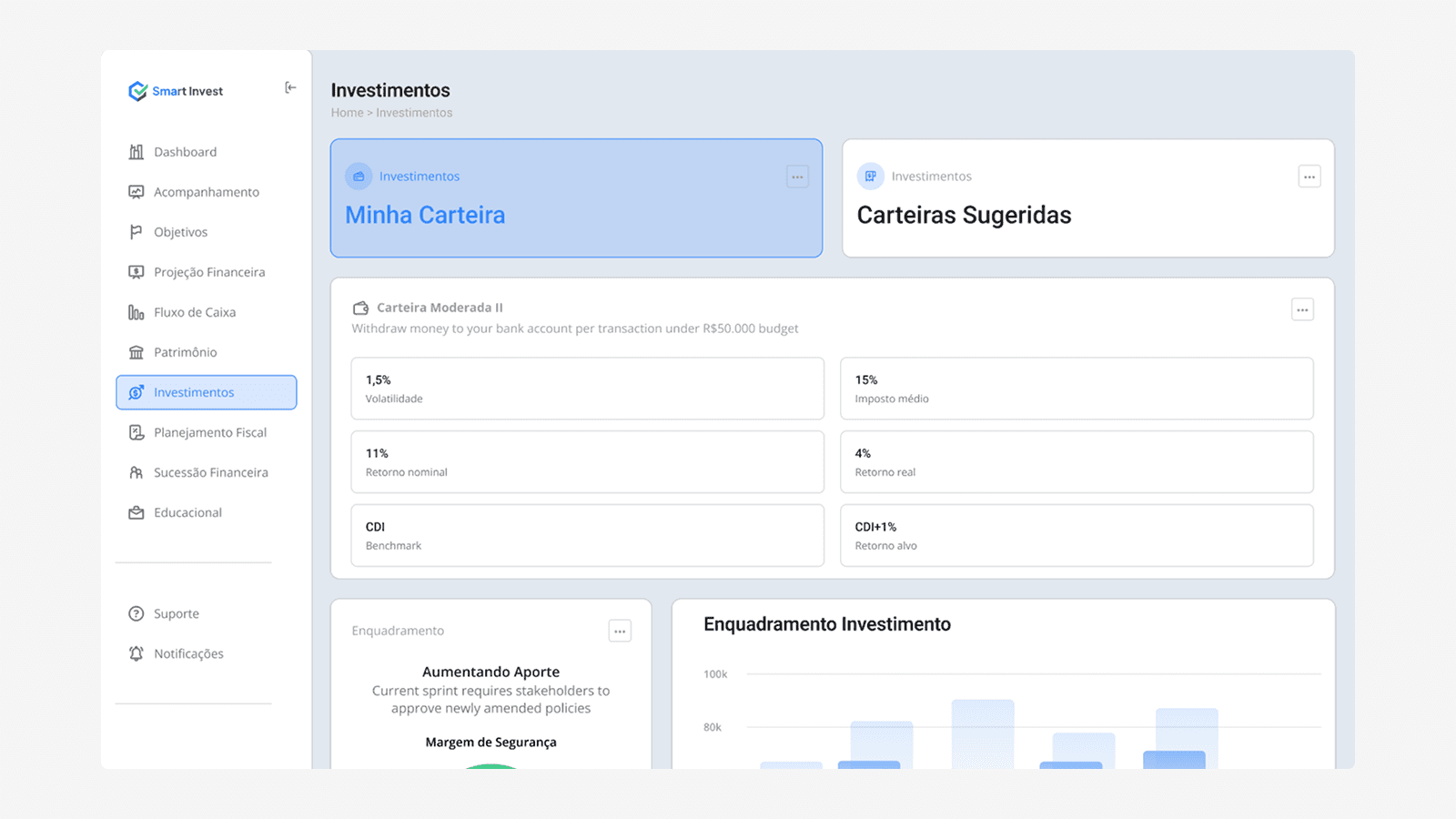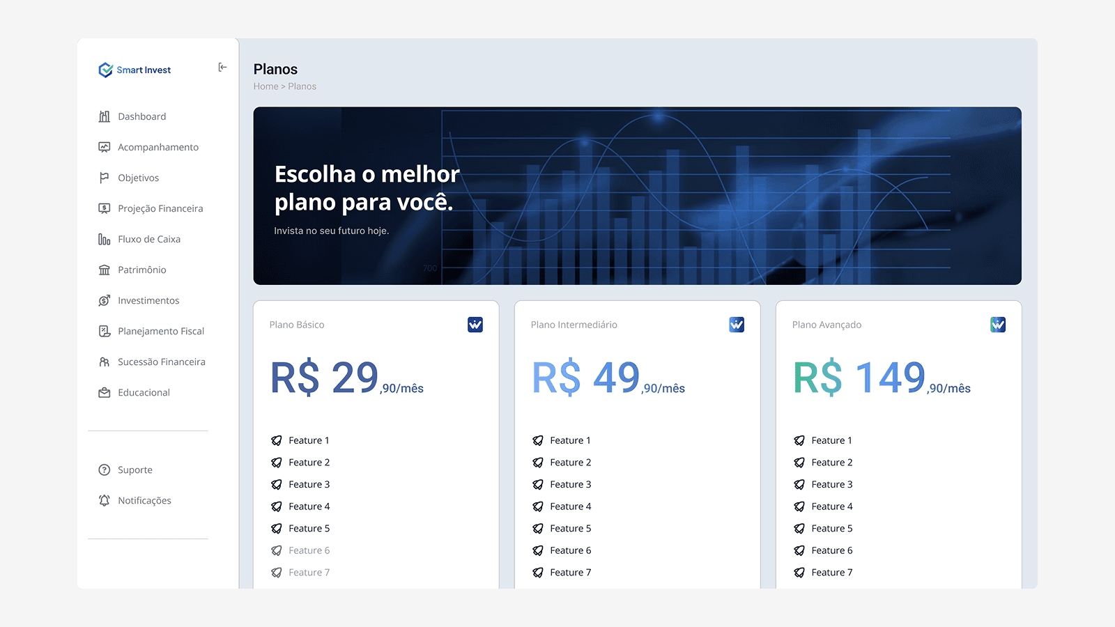 A SmartInvest nasceu para transformar a maneira como investidores interagem com plataformas digitais. O desafio era criar um ambiente que transmitisse segurança e sofisticação desde o primeiro clique. Em menos de 30 dias, entregamos um protótipo validado e pronto para escalar, com visual refinado e estrutura inteligente — tudo alinhado à jornada emocional e racional do investidor moderno.